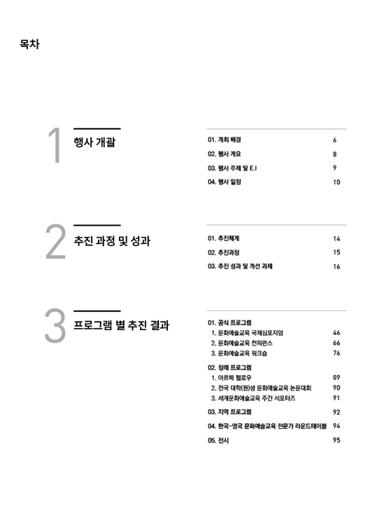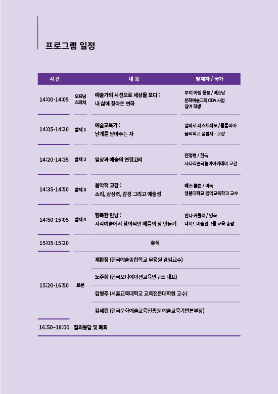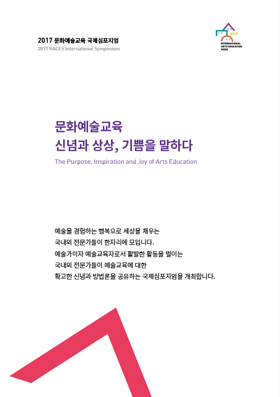 우연한 예술경험이 가져다 준 행복감은 한 사람의 인생을 충만하게 만들어주는 강력한 힘을 발휘할 수 있고, 숙련된 예술활동에서 발휘되는 예술가의 창의적인 발상은 자라나는 미래세대에 다른 시각으로 세상을 바라보는 눈을 뜨게 합니다.