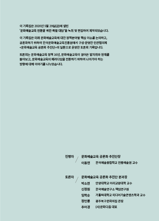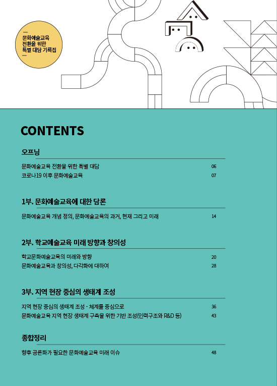4차 산업혁명에 따른 기술‧매체 환경의 변화와 맞물려 코로나19로 인한 비대면 시스템과 온라인 네트워크 사회 활동이 활발히 증가하고 있으며 동시에 온라인 학습에 대한 수요가 급격히 확대되고 있고, 교육 환경 전반의 패러다임 전환 필요성 또한 대두되고 있습니다. 이에 따라 향후 문화예술교육에 있어 온라인 교수-학습의 접근 관점과 현황을 살펴보고, 문화예술교육 방법론의 적용 방향과 실천 모델을 함께 모색해보고자 이번 온라인 토론회를 진행하게 되었습니다.